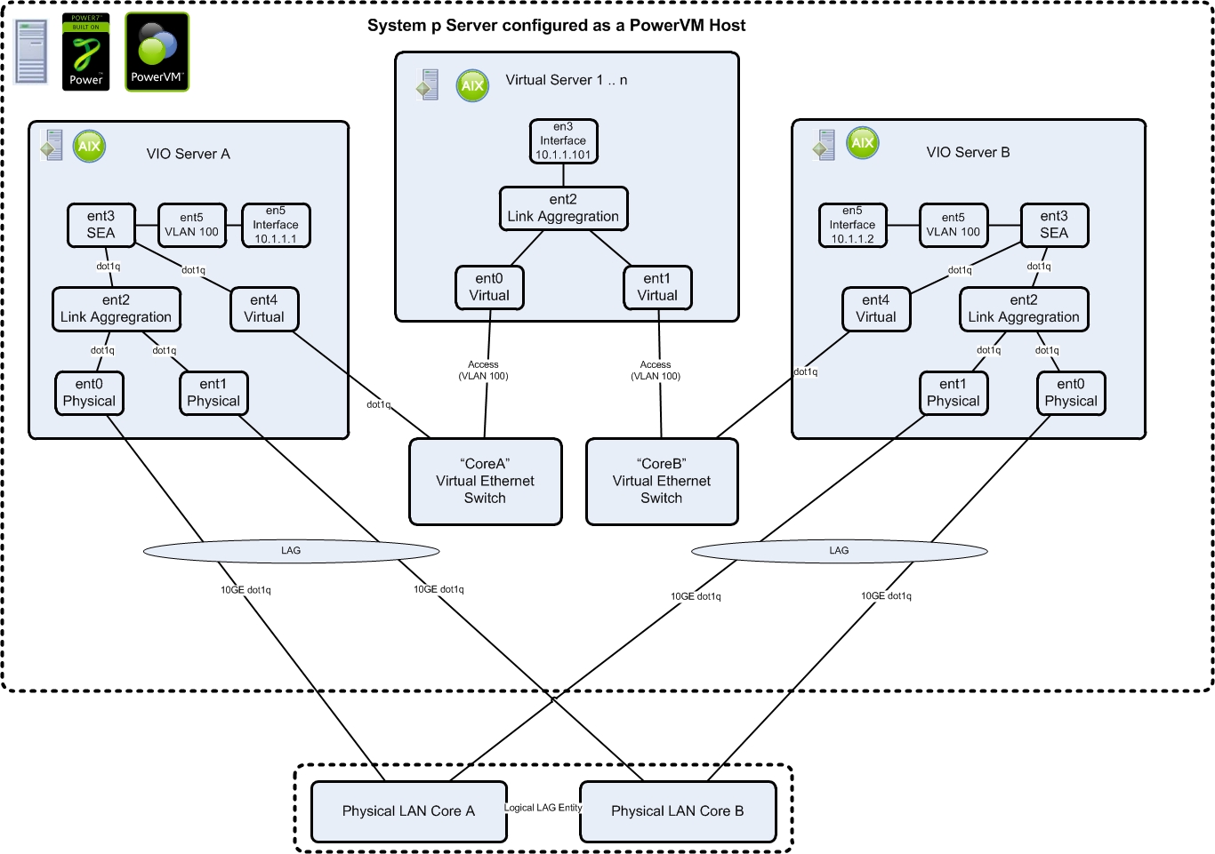 PowerVM does not have the concept of “VDS”, the closest is “VSS” manually built by hand within each VIO Server and via the HMC. This is the most complicated part of the puzzle, so bear with me. The Virtual I/O Server is responsible for network and storage I/O virtualisation. It uses “Shared Ethernet Adapters” with the VIOS and “Virtual Ethernet Switches” within the ASM to provide network connectivity to Virtual Servers. For Uplink redundancy, Link Aggregation is configured to bind two interfaces into one.