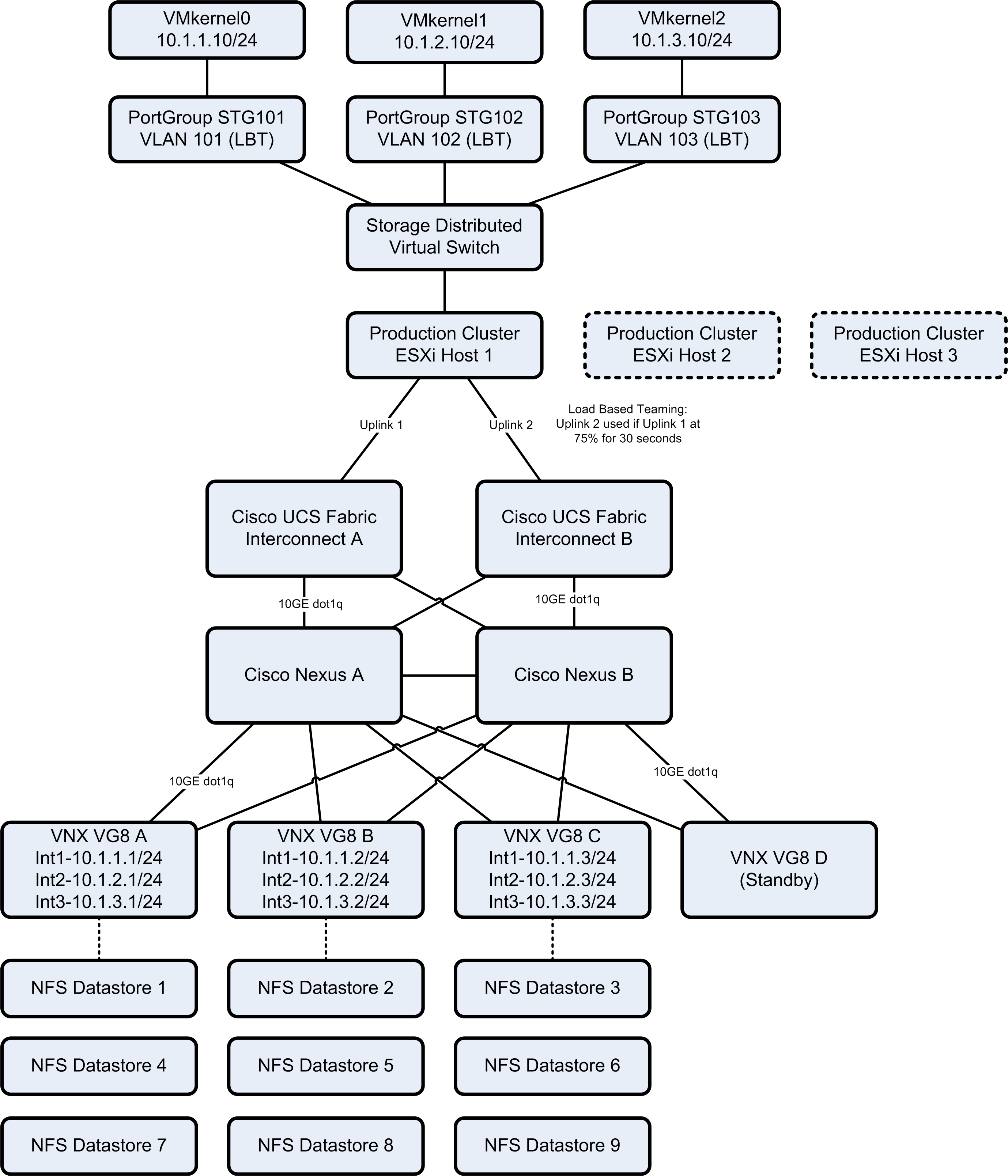 There should be a VDS dedicated to IP Storage. VDS Load Based Teaming will be used to load balance IP Storage traffic across the vmnics (separate Portgroups). Three or more VM kernels are required. Two or more NAS Engines are required with three virtual filer instances (separate Portgroups) per NAS box. Load balancing occurs across each pair of host vmincs, based upon Uplink load (75% utilisation for more than 30 seconds). If you are using rack mounted hosts, be very careful of using LACP direct to ESXi, carefully consider the pros and cons of what you are trying to achieve and involve your networking team. With this use-case, vPC is used to connect the Fabric Interconnects to the Core LAN Switches and the vNICs presented to the ESXi host are two separate 10GE links with no bonding. To use VDS and LBT you must have vSphere Enterprise Plus licences. End-to-End QoS must also be considered as described in this post.