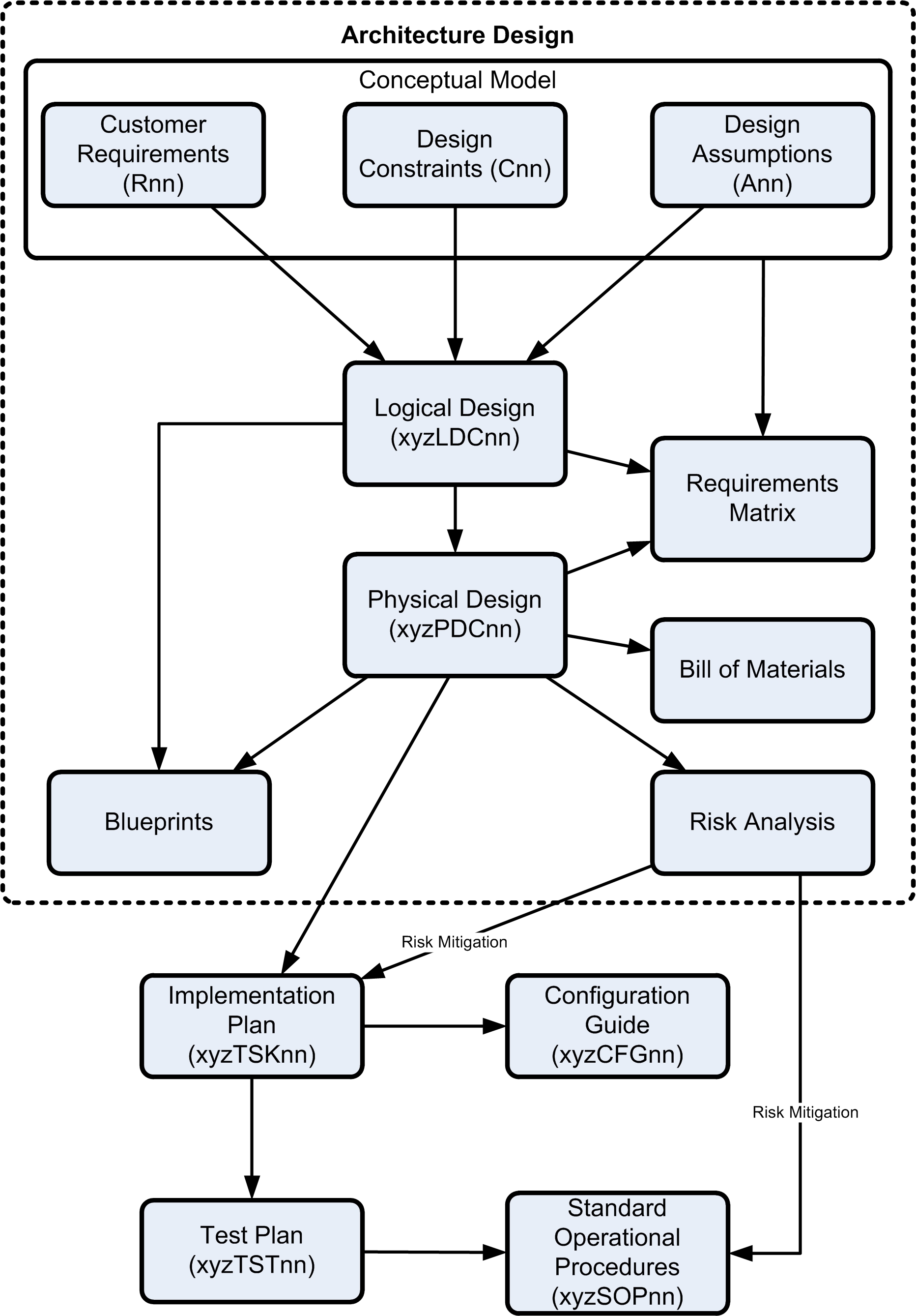 The strategy is very simple, create a linked list that maps from each physical design decision to the Implementation Plan, Configuration Guide, Test Plan and the SOPs. This is summarised in the diagram below: