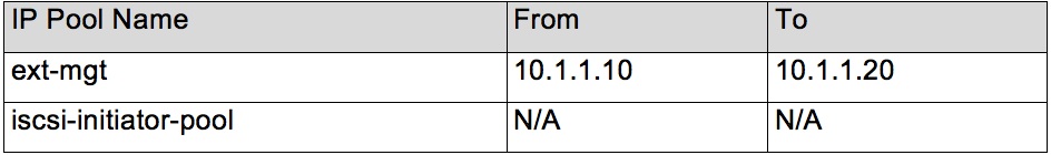 6. Modify the “IP Pool ext-mgmt” and “iscsi-initiator-pool” with the following settings. iSCSI is not required, but this configuration will clear the iSCSI alarm that appears.