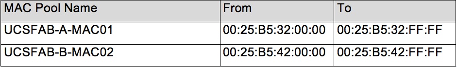 - Two Blocks of MAC Addresses for the virtual NICs, one for Fabric A and one for Fabric B – for this exercise the ranges 00:25:B5:32:00:00 – 00:25:B5:32:FF:FF & 00:25:B5:42:00:00 – 00:25:B5:42:FF:FF will be used.
