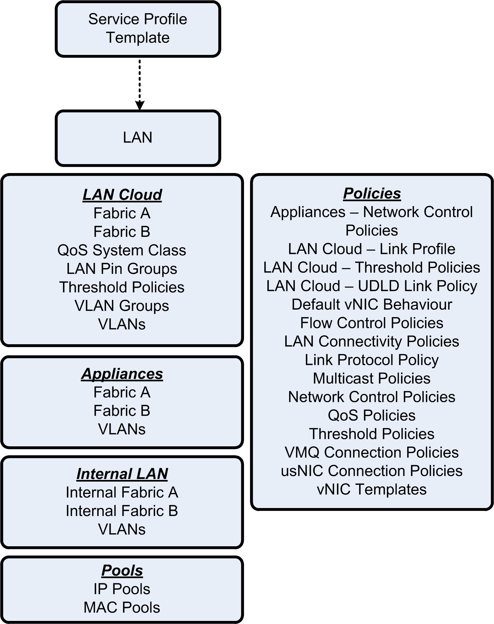 The UCS Manager LAN configuration has five areas: LAN Cloud, Appliances, Internal LAN, Pools and Policies. The diagram below shows the breakdown of those areas.