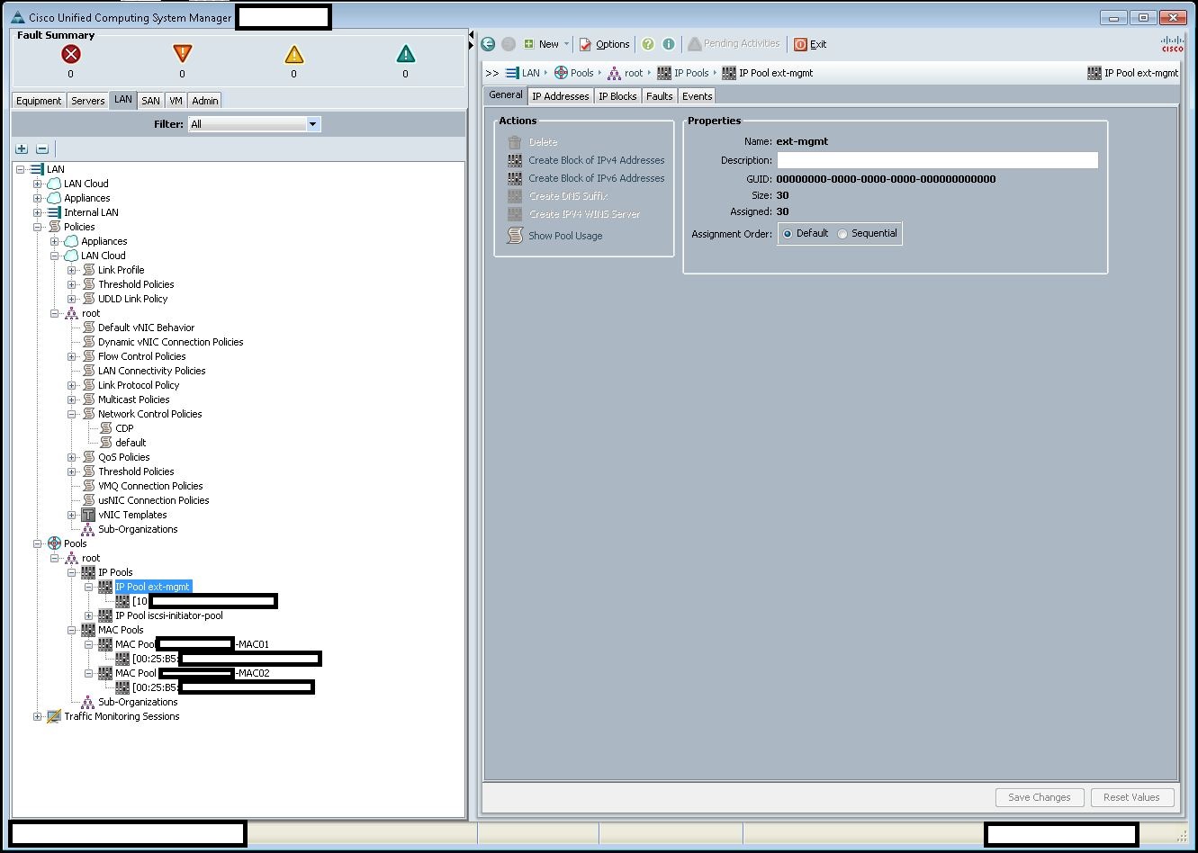 5. Configure the IP and MAC pools, by selecting the “Pools” tree and then the “IP Pools” object. Refer to Screenshot below.