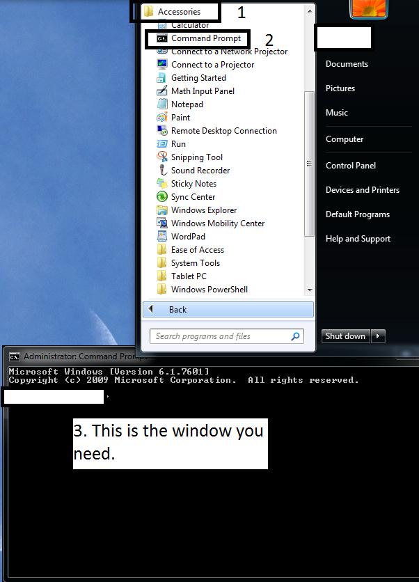 Windows 7 PC: Go to Start Button, All Programs, Accessories, Command Prompt. This screen should open:
