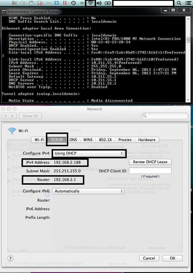 A. Type “ipconfig /all” on Windows 7. On OS X, go to Wireless icon on top right corner, Open Network Preferences, Advanced, TCP/IP tab. For Windows 7 you will see an IP address in the “Default Gateway” field. For OS X, you will see an IP address in the “Router” field. This is used in Part B.