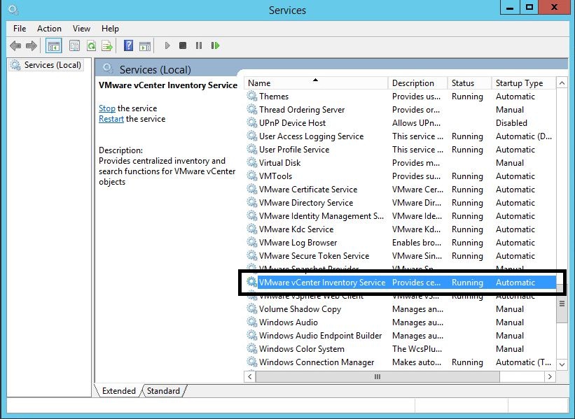 - Open the Services application and verify that the VMware “vCenter Inventory” service is installed and running.