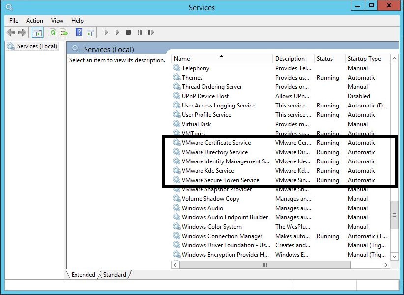 - Open the Services application and verify that the VMware “Certificate”, “Directory”, “Identity Management”, “Kdc” and “Security Token” services are installed and running.