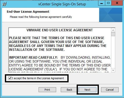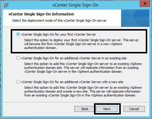 - Select “vCenter Single Sign-On for your first vCenter Server” is selected and press “Next”.