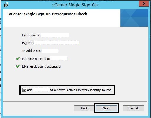 - Make sure “Add <domain> as a native Active Directory identity source” is ticked and then press “Next”.