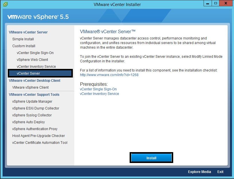 - In the VMware vSphere 5.5 vCenter Installer window, select “vCenter Server” from the “Custom Install” and press “Install”.