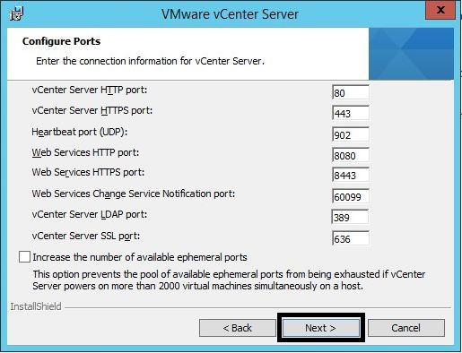 - If you used custom ports in vCenter 5.1, then make sure you know what they are, so that you can configure them here. You will have to modify your firewall rules since the vCenter services are now centralised.