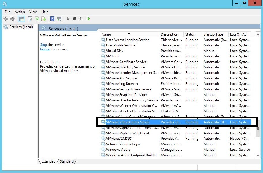- Open the Services application and verify that the VMware “VirtualCenter Server” service is installed and running.