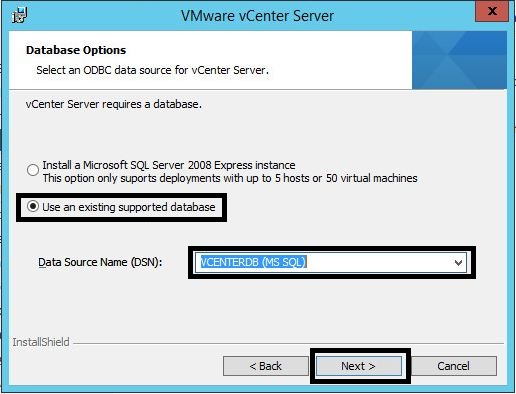 - Select “Use an existing supported database” and select “VCENTERDB (MS SQL)” from the DSN list. Then press “Next”.