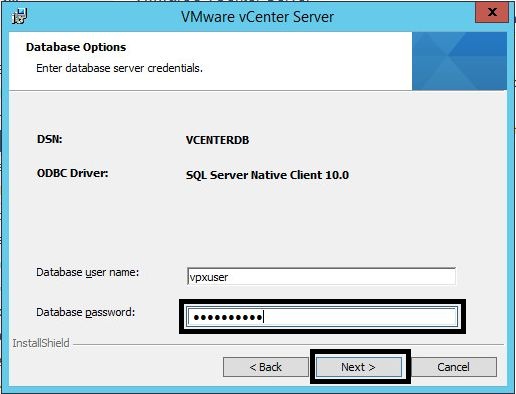 - Enter the “vpxuser” “Database password” and press “Next”.