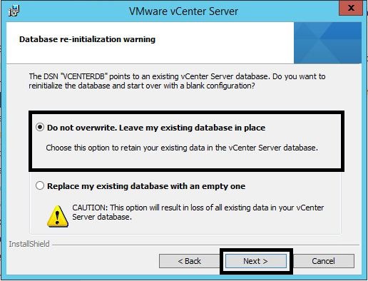 - Select “Do not overwrite. Leave my existing database in place” and press “Next”.