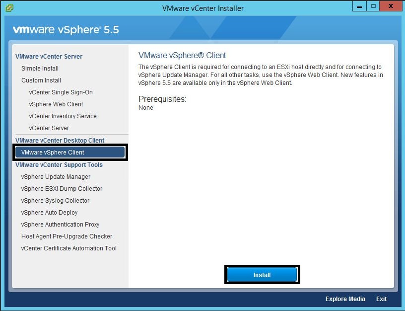- In the VMware vSphere 5.5 vCenter Installer window, select “VMware vSphere Client” from the “VMware vCenter Desktop Client” and press “Install”.