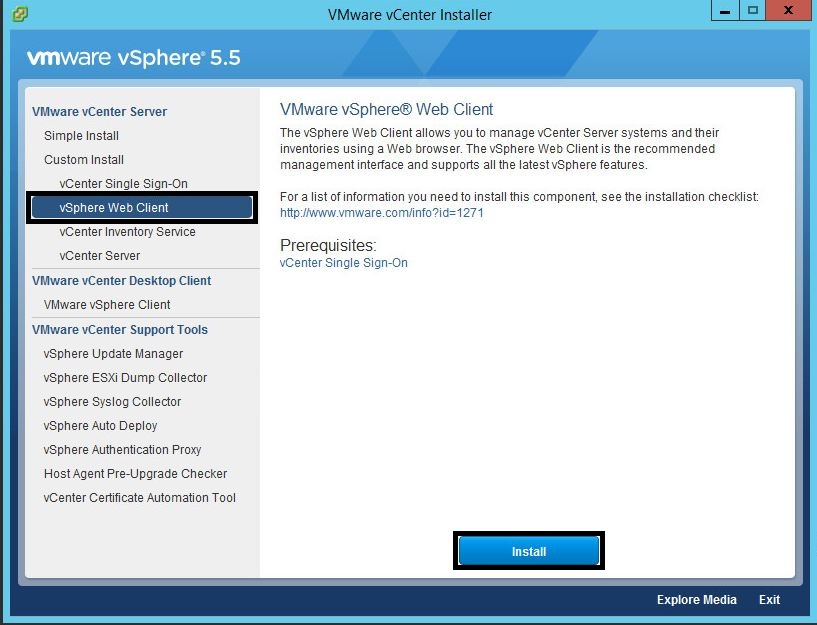 - In the VMware vSphere 5.5 vCenter Installer window, select “vSphere Web Client” from the “Custom Install” and press “Install”.