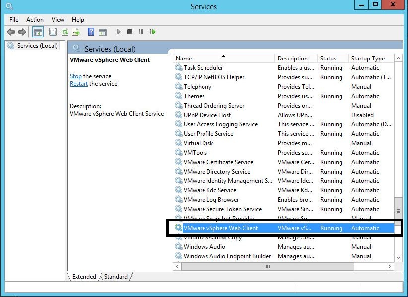 - Open the Services application and verify that the VMware “vSphere Web Client” service is installed and running.