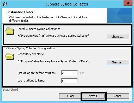 - Change the Install and Repository locations to “F:” and press “Next”. Make sure F: has enough capacity for storing logs (40GB). This will vary based upon the size of the log rotation and number of log rotations to keep.