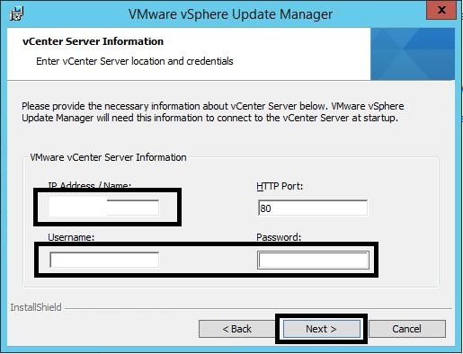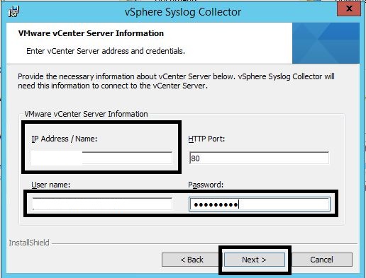 - Enter the vCenter “IP Address”, “Username” (service account) and “Password” and press “Next”.