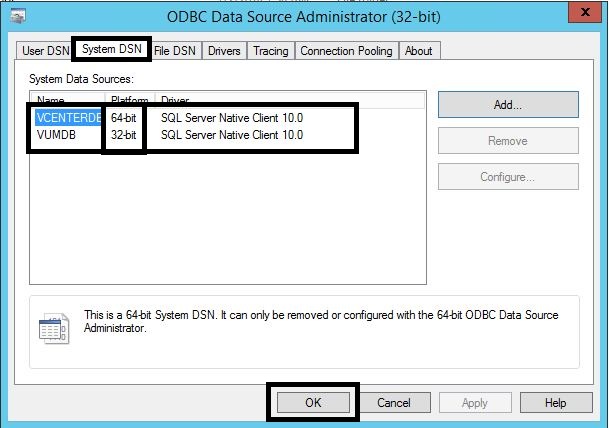 - Select the “System DSN” tab and then press “Add”. Note the existing 64bit DSN for the vCenter DB already configured in Part 2.
