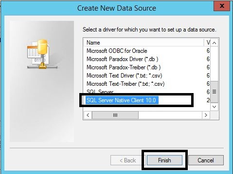 - Scroll down to the bottom and select the “SQL Server Native Client 10.0” driver and then press “Finish”.