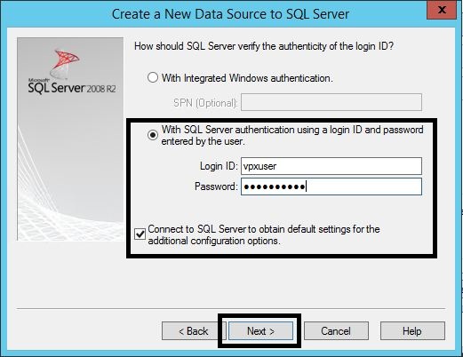 - Select “With SQL Server authentication using a login ID and password assigned by the user”, use the “vpxuser” and password and press “Next”.