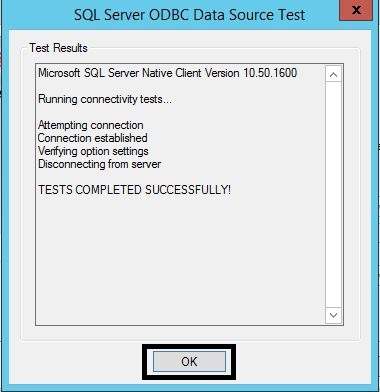 - Select “Test Data Source”. Verify “TESTS COMPLETED SUCCESSFULLY!” appears and select “OK”. Then select “OK” again.