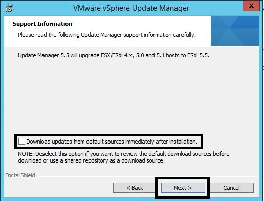 - In the VMware vSphere 5.5 vCenter Installer window, select “vSphere Update Manager” from the “VMware vCenter Support Tools” and press “Install”.