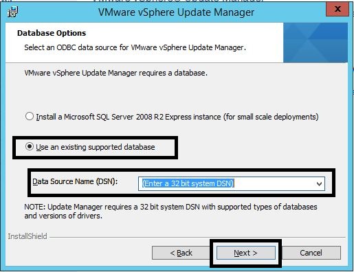 - Select “Use an existing supported database” and select “VUMDB” from the “DSN” drop down menu. Press “Next”.
