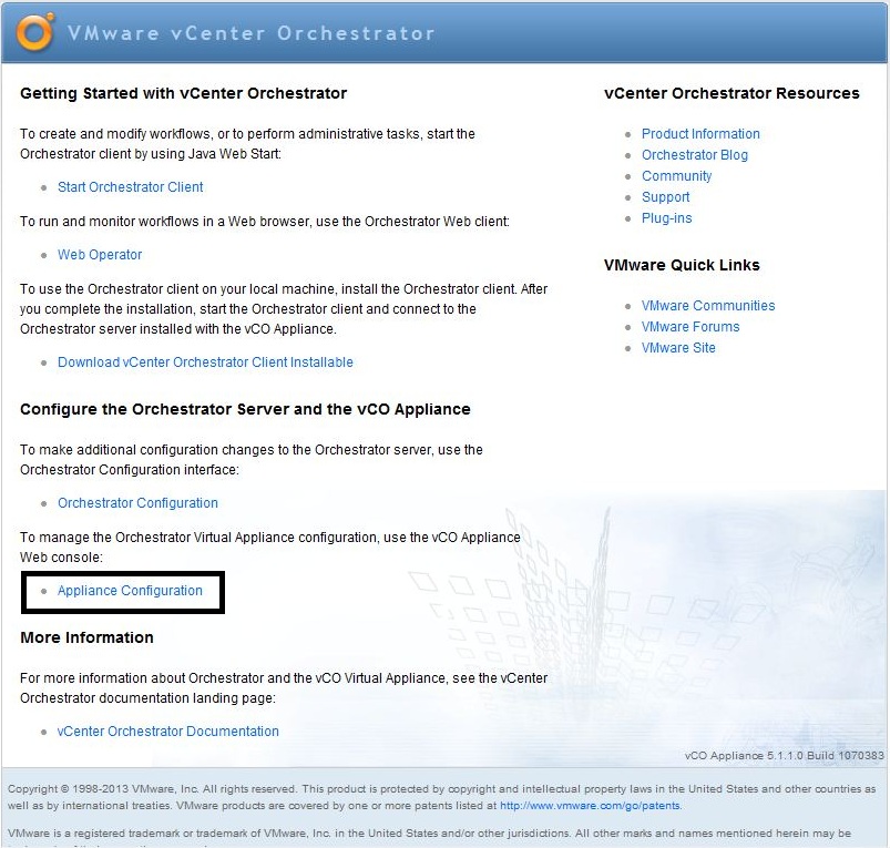 - Press the “Appliance Configuration” link which will connect to http://<vCO IP Address>:5480/.