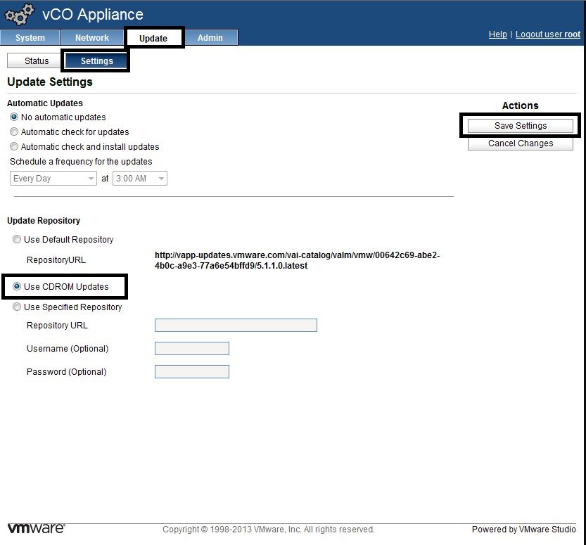 - Press the “Update” tab and then the “Settings” button and set the “Update Repository” to “Use CDROM Updates” and press “Save Settings”.