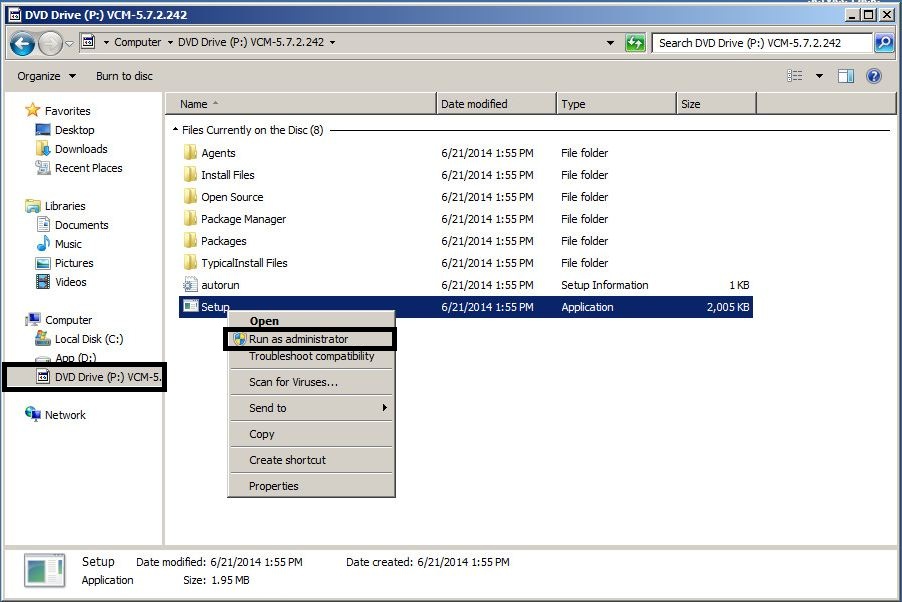 - Login as the vCM administrator user and run the “Setup.exe” binary with “Run as Administrator”.