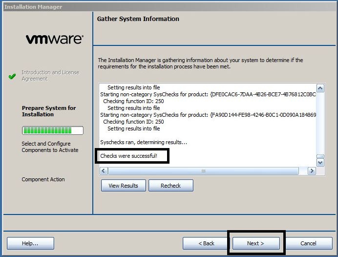 - In the “Gather System Information” screen, verify the “Checks were successful!” message and press “Next”.