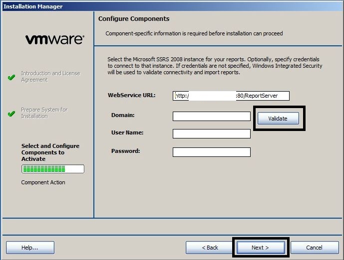 - In the second “Configure Components” screen, press “Validate” and press “OK” if the “Insecure state” message appears. Then press “Next”.