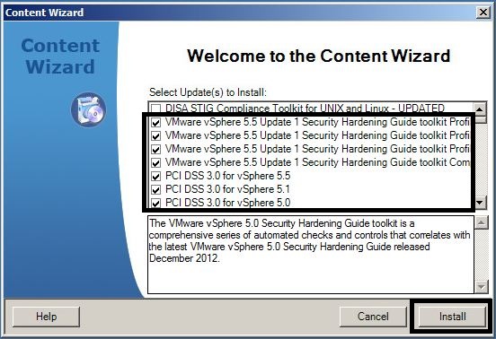 - In the “Welcome ot the Content Wizard” screen, select the updates required and press “Install”.