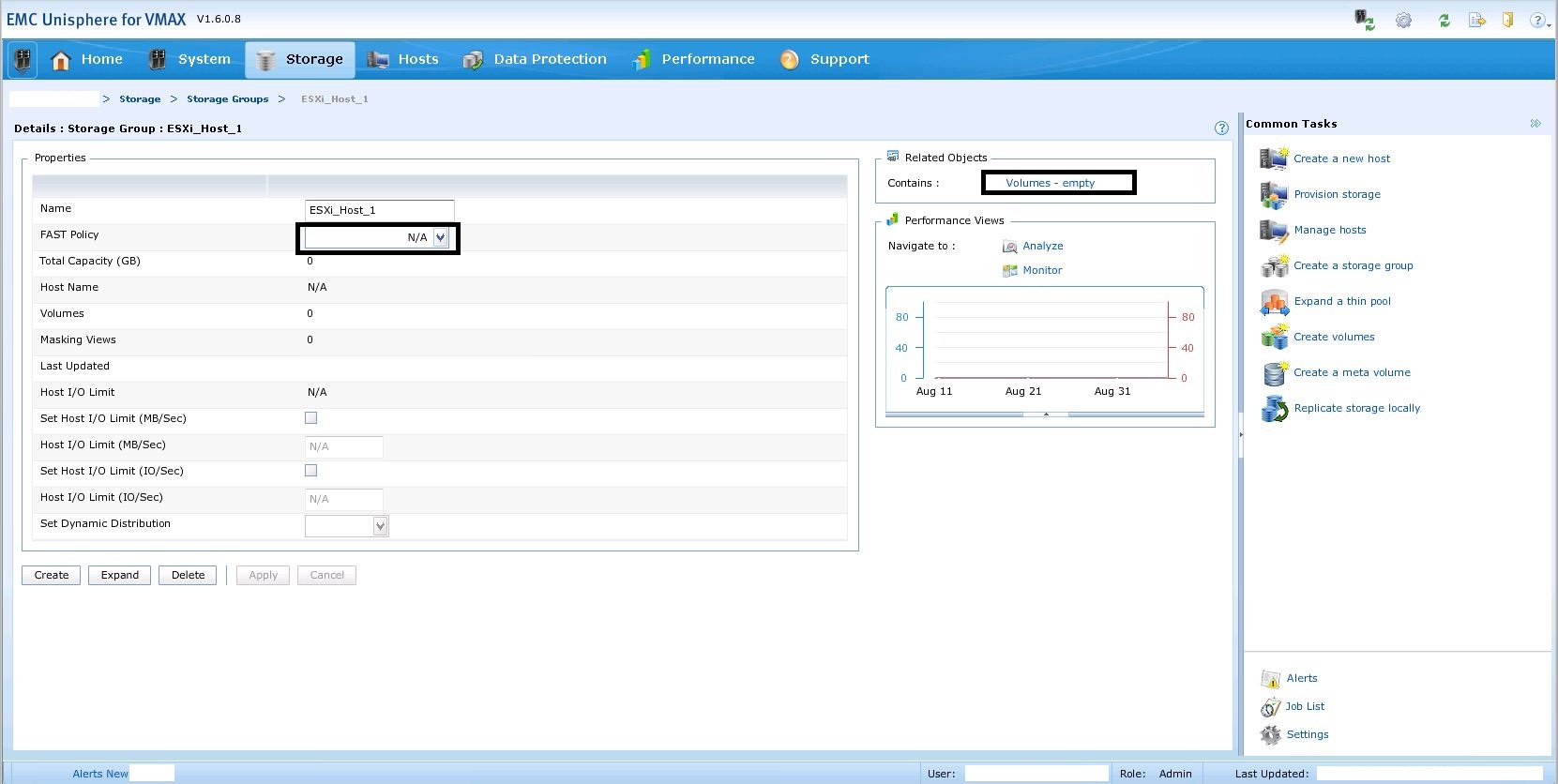 - In the “Storage Group Details” window, select the appropriate FAST Policy and press the “Volumes Empty” link to assign the TDEV.