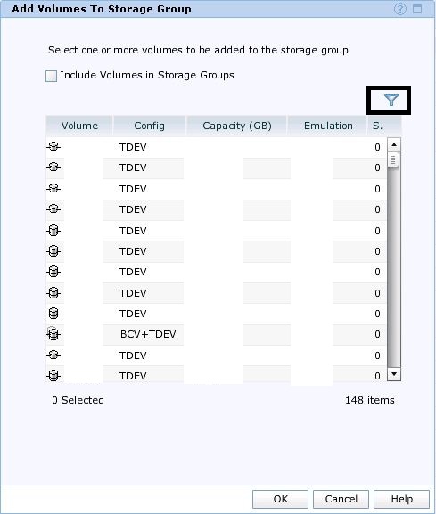 - In the “Add Volumes to Storage Group” window, press the “Filter” button and then expand the “Volume Identifier” object and enter the TDEV serial number (“0C08” in this example) in the “Volume ID” field. Then press “OK”.