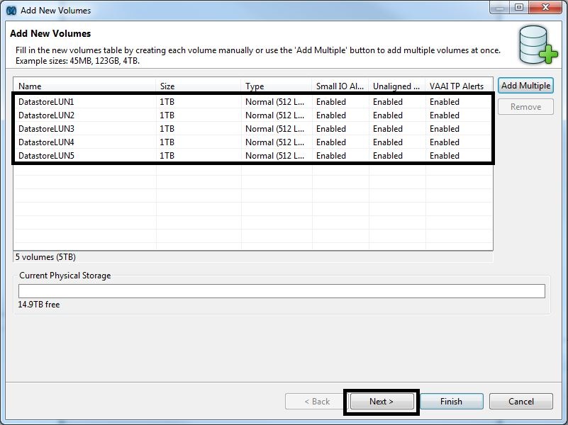 - In the “Add Multiple Volumes” window, select the “Number of Volumes” to create, enter the “Name”, the “Size” (with MB, GB, TB designated), the “Type” (“Normal 512 LBs” for vSphere) and tick the three options (“Enable Small IO Alerts”, “Enable Unaligned IO Alerts” and “Enable VAAI TP Alerts”). Then press the “OK” button.