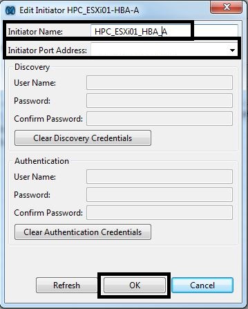 - In the “Add Initiator” window, enter the “Initiator Name” and select the “Initiator Port Address” from the drop down list. If the ESXi hosts and XtremIO FC ports have not been zoned, then you will have to manually enter the ESXi HBA WWPN. Press “OK”.