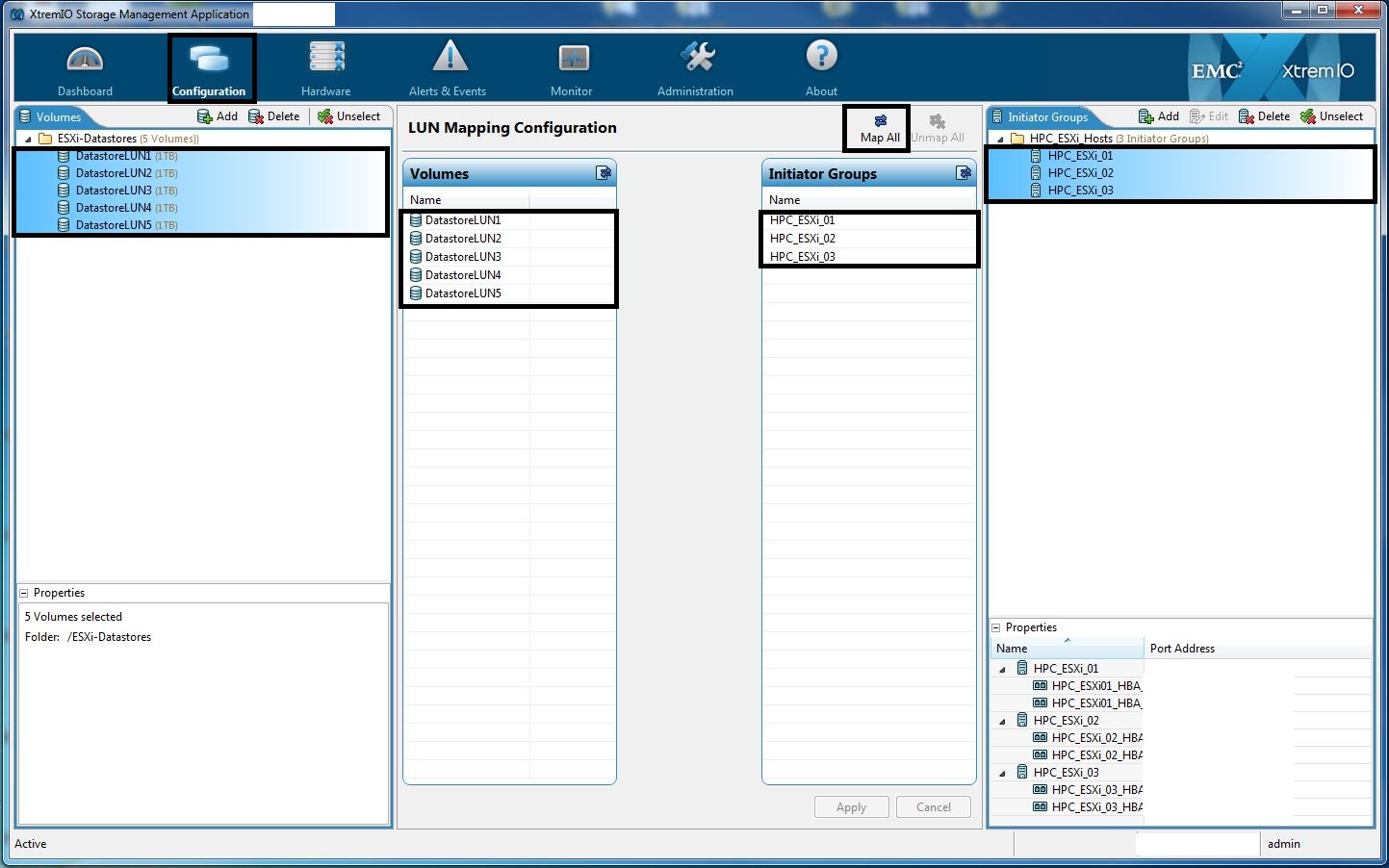 - In the main “Configuration” window, select the “Volumes” and “Initiator Groups” to be mapped.