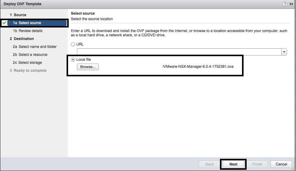 - In the “1a Select Source” window, select “Browse”, locate the “VMware-NSX-Manager-6.0.4-1752381.ova” file and press “Next”.