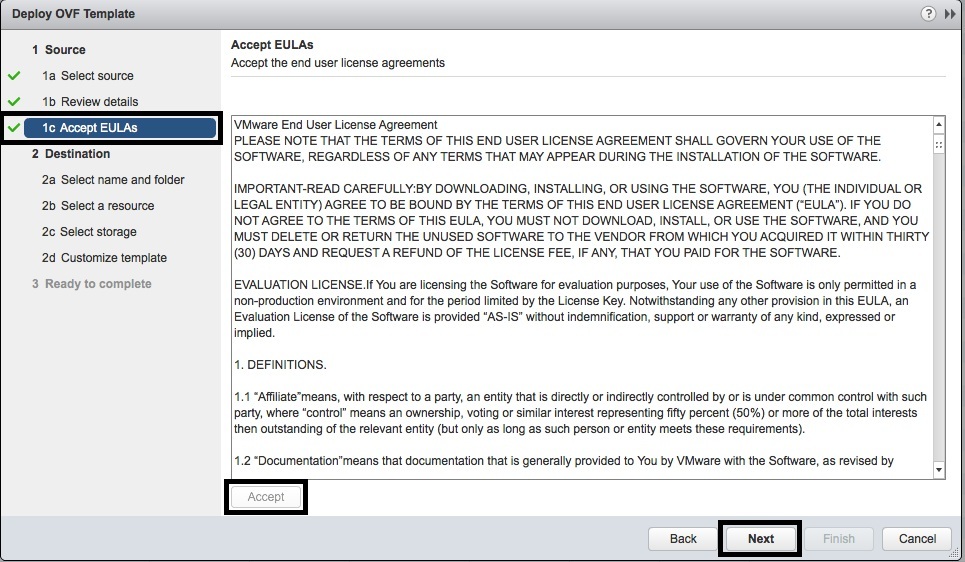- In the “1c Accept EULAs” window, press the “Accept” button and then press “Next”.