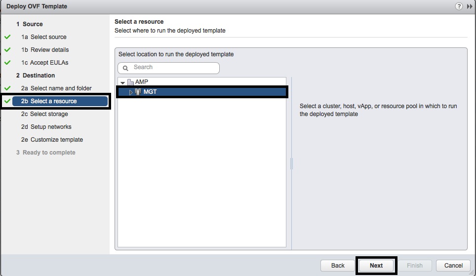 - In the “2b Select a resource” window, select the “Resource” to run the NSX Manager virtual appliance. Then press “Next”.