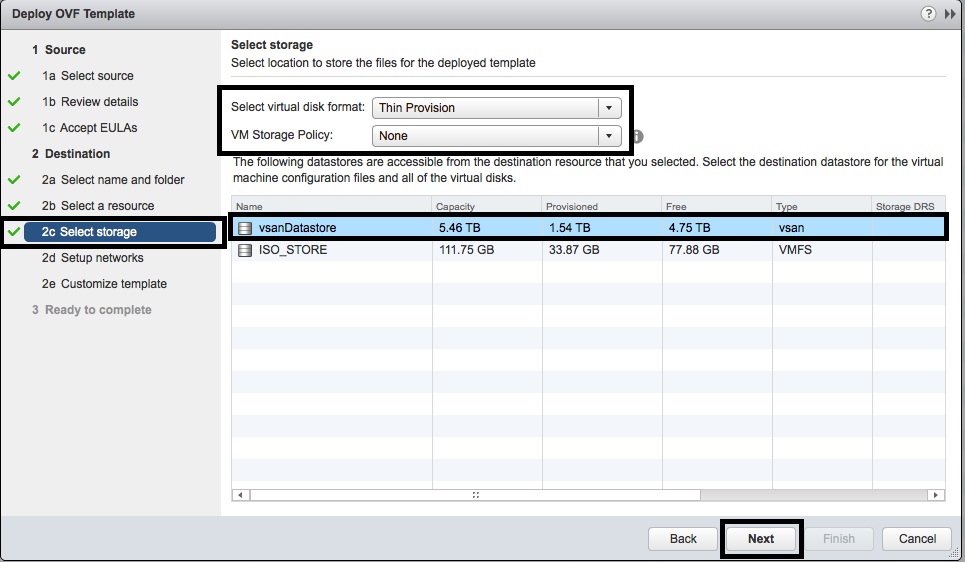 - In the “2c Select storage” window, select the “VM Storage Policy” and the “Destination Datastore” for the NSX Manager virtual appliance. Then press “Next”.