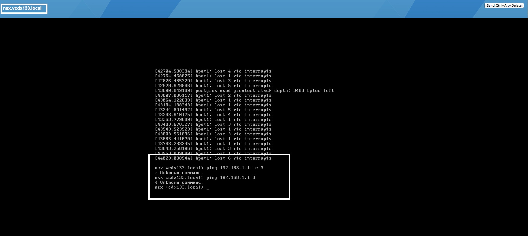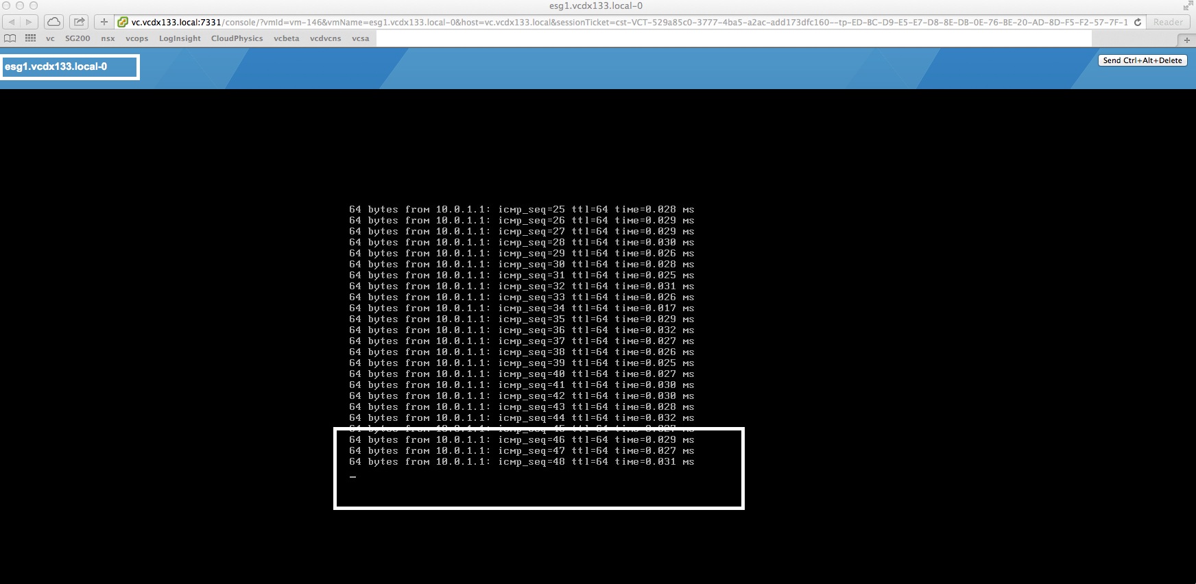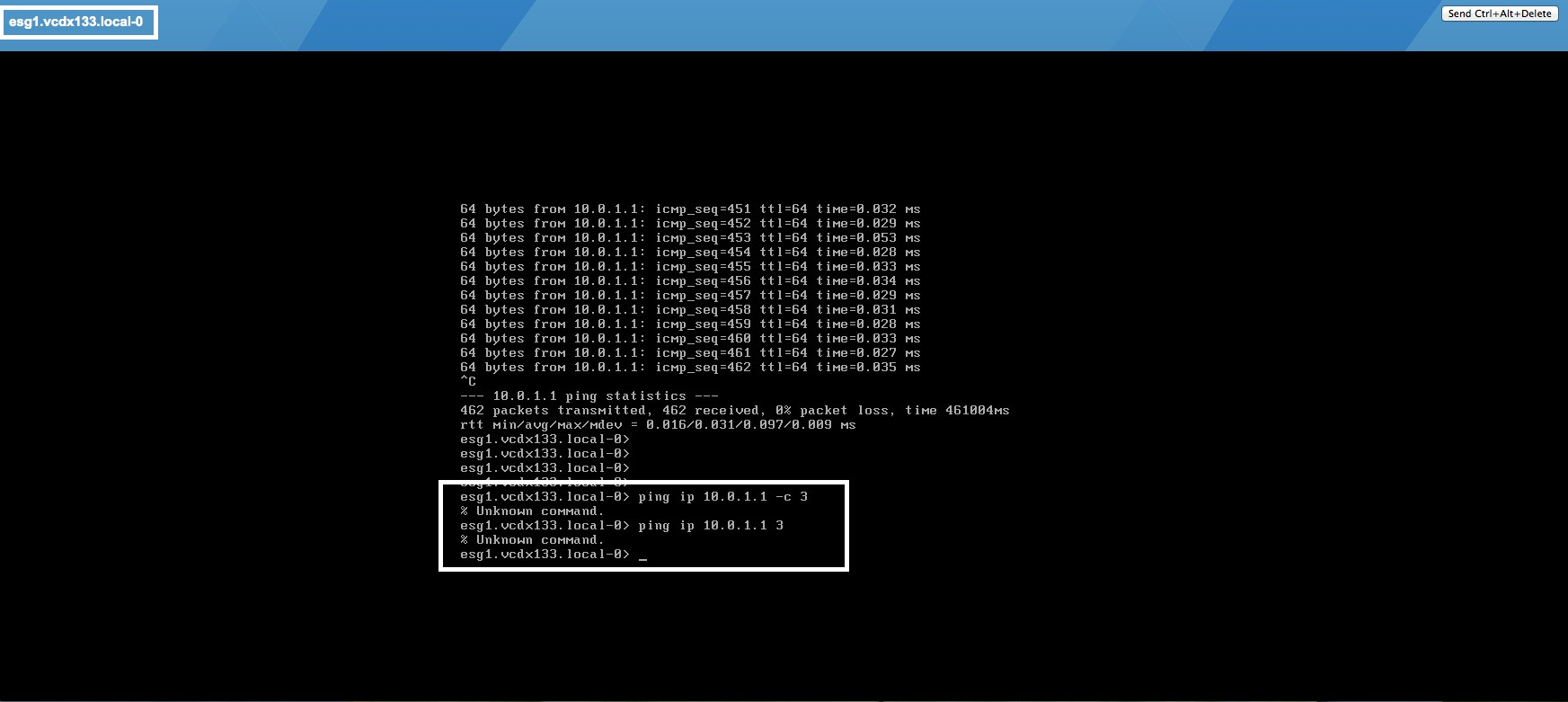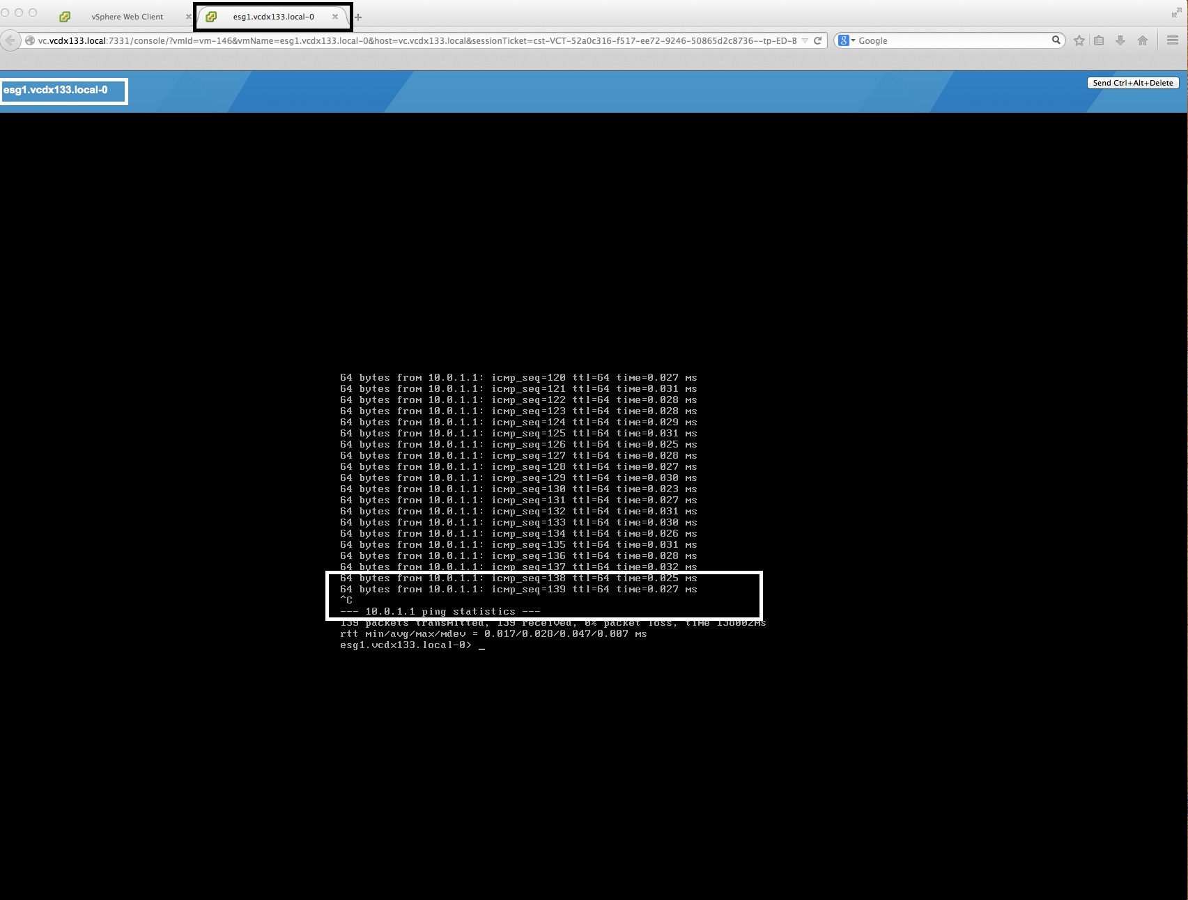 Short answer to the question, only the NSX Controller with the command format “ping <IP Address/Hostname> <Desired Count>”. The NSX Manager, Edge Services Gateway and Logical Distributed Router only support “ping <IP Address/Hostname>” or “ping ip <IP Address/Hostname>” or “ping ipv6 <IP Address/Hostname>”. So use the Mozilla browser with the vSphere Web Client for the “Control-C” exit sequence to work.