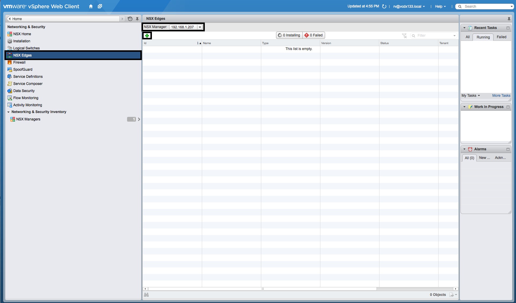 - Select “NSX Edges”, the correct “NSX Manager” IP Address and select the green “+” button.