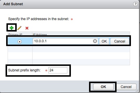 - In the “Add Subnet” window, enter an IP Address from the Logical Switch, enter the “Subnet prefix length” (most likely Class C – “24”) and press “OK”.
