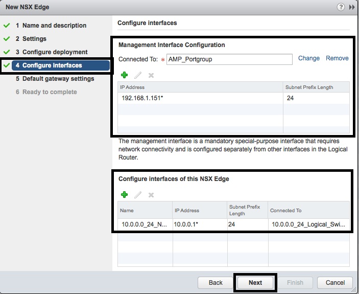 - In the “4 Configure Interfaces” screen, add the second interface as an “Uplink”. This will connect to the ESG. Then press “Next”.