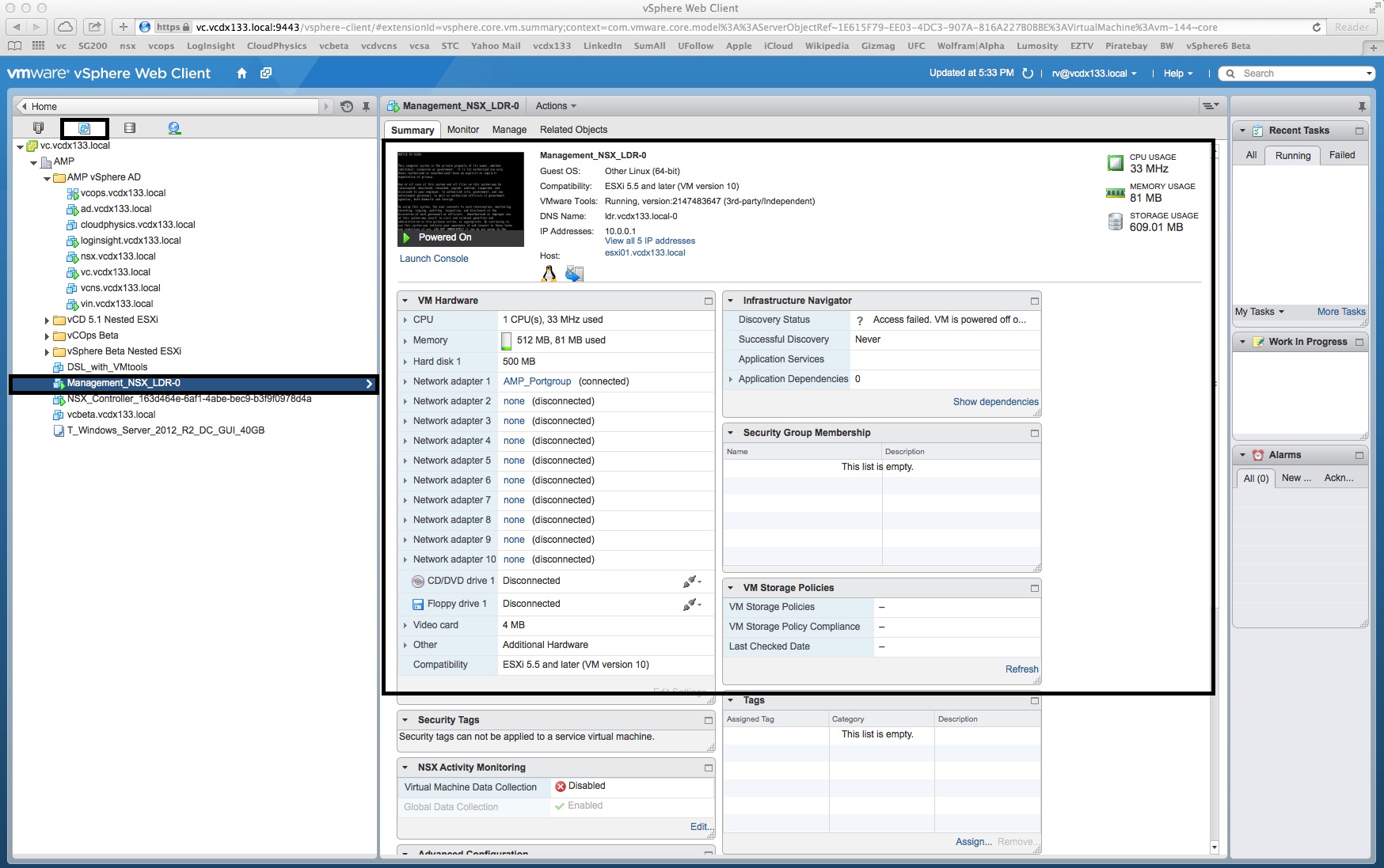 - From the VM Summary tab, you can see that the LDR is deployed with the default VM Hardware resources of 1 vCPU, 512MB RAM and 500MB Hard Disk. Also note that only a single Console session can exist concurrently and vSphere Infrastructure Navigator has no visibility of the LDR.